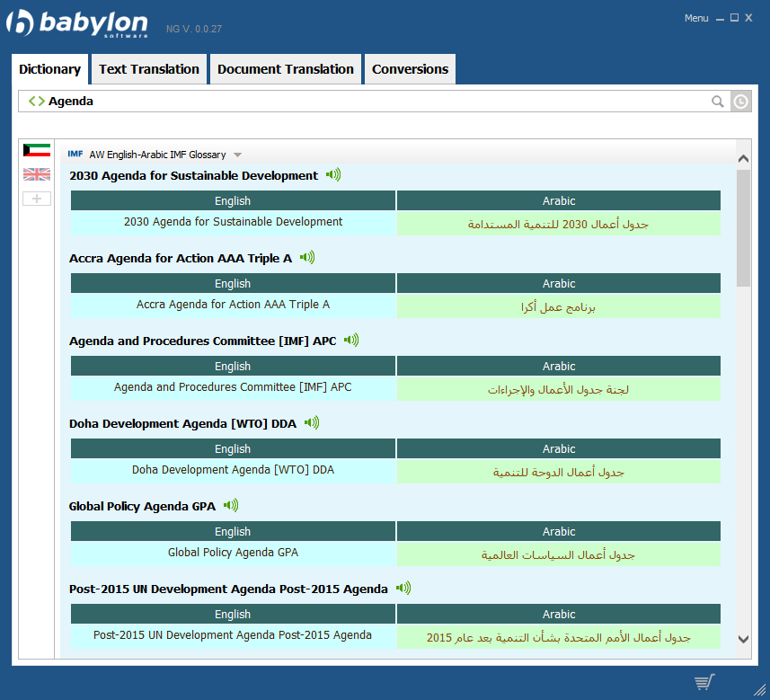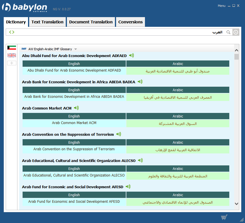 Description: AW English<>Arabic IMF Glossary (Babylon and GoldenDict version) contains terms used by International Monetary Fund (IMF). Glossary screenshot 1 & Glossary screenshot 2. This glossary is searchable in English and Arabic. |