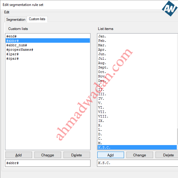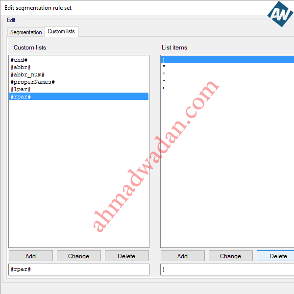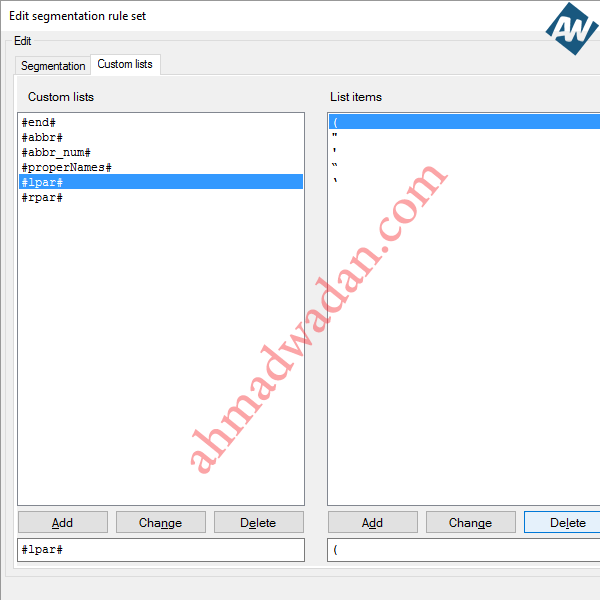 MemoQ segmentation issue (unwanted segment split)Problem:MemoQ splits XXX Company K.S.C. (Closed) into two Translation Units (TUs) as follows: TU1: XXX Company K.S.C. TU2: (Closed) Traditional solution:Use MemoQ "Join" function (Ctrl+J) Smart solution:1. Add abbreviation: ![]() 2. Delete this item "(": ![]() 3. Delete this item ")": ![]() Note: you can use the same rule to solve similar issued by adding whatever abbreviations you want such as (W.L.L. - Ltd. - J.S.C. - O.S.C. if such abbreviations are followed by "(any word)" and you do not want MemoQ to split it).