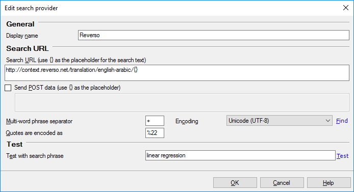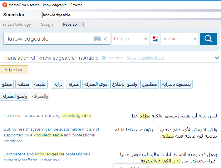 كيفية إعداد خاصية Web search: اضغط على الترس الأوسط في الشكل التالي ![]() شكل 1 اضغط على أيقونة Web search ثم اختر Web search settings للغة التي تختارها أو Create new (شكل 2): ![]() شكل 2 ستظهر لك قائمة بمقدمي خدمة البحث حيث تستطيع الاختيار منها كما تشاء. في الشكل التالي اخترت Create new وأضفت مزودي الخدمة الذين أرغب فيهم فقط (شكل 3): ![]() شكل 3 لإعداد مقدم خدمة ما اضغط على أيقونة القلم في شكل 3 لفتح نافذة الإعدادت التالية وكتابة معلومات البحث تحت Search URL في (شكل 4): ![]() شكل 4 الآن وأنت تترجم باستخدام ميموكيو ظلل الكلمة التي تبحث عنها في اللغة التي تترجم منها ولتكن مثلا "knowledgeable" واضغط على Ctrl+F3 فتظهر لك النافذة التالية (شكل 5): شكل 5 للتنقل بين مختلف نتائج البحث اضغط على لسان تبويب Tab آخر للاطلاع على نتائج أخرى (شكل 6): ![]() شكل 6 الجدير بالذكر أن لكل محرك بحث أو قاموس كود خاص به لا بد من استخدامه في إعدادات نافذة كل search provider كي تظهر لك نتائج ما تبحث عنه وقد يشترك مع غيره في نفس الكود وسأذكر لكم لاحقا أهم الأكواد التي تعين المترجم على الوصول إلى المعلومة سريعا ومنها موقع Reverso الذي أوضحت الكود الخاص به في شكل 4 أعلاه. |